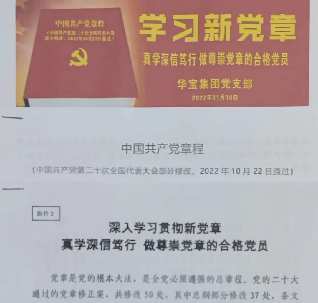 學(xué)習(xí)新黨章 做尊崇黨章的合格黨員 習(xí)近平總書記指出:“黨章是我們立黨、治黨、管黨的總章程,是全黨最基本、最重要、最全面的行為規(guī)范。”黨的二十大審議通過的《中國共產(chǎn)黨章程(修正案)》,凝聚了全黨的共同意志,切實(shí)鞏固了黨的二十大的重大政治成果,為全面建設(shè)社會主義現(xiàn)代化國家、全面推進(jìn)中華民族偉大復(fù)興統(tǒng)一了思想、意志和行動。 2022年11月10日,華寶集團(tuán)黨支部開展了學(xué)習(xí)新黨章的活動,組織黨員逐字逐句學(xué)、原原本本學(xué),把黨章學(xué)深學(xué)透,特別是針對新修改的內(nèi)容,不時展開熱烈的討論。通過學(xué)習(xí),引導(dǎo)支部黨員嚴(yán)格遵守黨章、堅(jiān)決貫徹黨章,嚴(yán)肅維護(hù)黨章,做一名合格黨員。