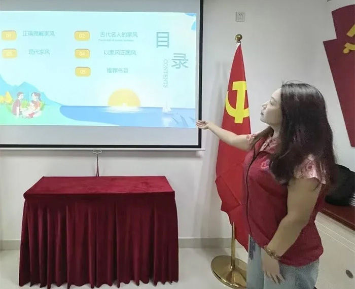 宣講中,石獅市三八紅旗手秦慧霞圍繞“正確理解家風(fēng)、古代名人的家風(fēng)、現(xiàn)代家風(fēng)、以家風(fēng)正國風(fēng)、新型家庭觀、婚育觀”等方面,引導(dǎo)石獅市華寶集團(tuán)婦聯(lián)成員從自身做起,從家庭做起,傳承和弘揚(yáng)好家教好家風(fēng),推動移風(fēng)易俗工作見行見效,讓“文明之花”開遍每個(gè)角落。 緊接著,巾幗志愿者、黨員志愿者與石獅市華寶集團(tuán)婦聯(lián)成員觀看《習(xí)近平家風(fēng)世澤長》視頻,通過觀看此視頻,深刻領(lǐng)會習(xí)近平總書記關(guān)于家庭、家教、家風(fēng)的重要論述,將家庭美德融入到日常的學(xué)習(xí)和生活中,努力成為良好家風(fēng)的傳承者和踐行者。